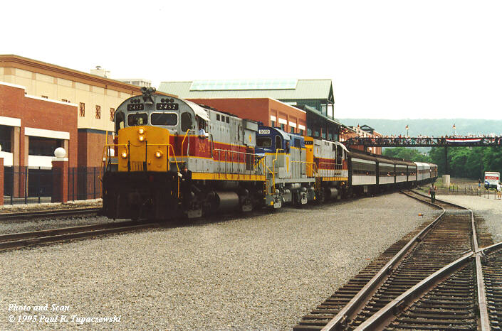 Around Noon, the early morning excursion carefully returned with the no. 2317 running backwards pulling the train to the platform. The NYS&W E9 now played the role of "observation car," and was conveniently out in the open for photographers to shoot. (Photo): (Photo) After unloading, the train quickly made its way east again to the first passing siding. It was to meet a special excursion being run from Pocono Summit for the NRHS Convention (being held in Lancaster). Delaware-Lackawanna power was scheduled to handle the run, but what appeared coming down the grade into the Steamtown facility surprised more than a few people. (Photo) In the distance, a "ghost" of sorts - two Erie Lackawanna units spliced by a Delaware & Hudson "lightning stripe" unit! (Photo) As the train neared, it became evident what was going on: The two "EL" units were Delaware-Lackawanna C425's, repainted into the EL scheme (but with D-L lettering) and even renumbered into their original EL numbers, 2452 and 2461. (Photo) The "D&H" unit is a Delaware-Lackawanna RS36, repainted into D&H paint and its D&H number, 5019, but with D-L lettering as well. In fact, the road went so far as to create a new shield with "The D&L" replacing "The D&H" to complete the image. (Photo) Needless to say, all three units made quite a sight.